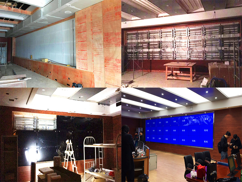 此次項目較大較為復雜,時間緊任務急,要在指揮中心安裝兩套大屏,分別采用信弘55寸(S55-XHL1ME)1.8mm拼縫,3×8,24塊液晶拼接屏,和55寸(S55-XHL2ME)3.5mm拼縫,3×5,15塊液晶拼接屏,前維護安裝方式。為保證項目整體順利實施,信弘工程師克服了現(xiàn)場諸多困難,努力將細節(jié)之處做到完美,安裝、調(diào)試、驗收、培訓等都非常順利,在春運前順利完成施工。