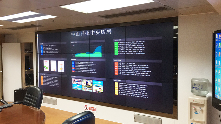 新媒體4k拼接屏_中山日報社中央廚房_信弘55寸拼接屏項目,新聞生產更有效率,更符合當代新聞傳播的特點,更好的滿足用戶需求,從而加強內容供給側改革,加速日報社向新媒體轉型。