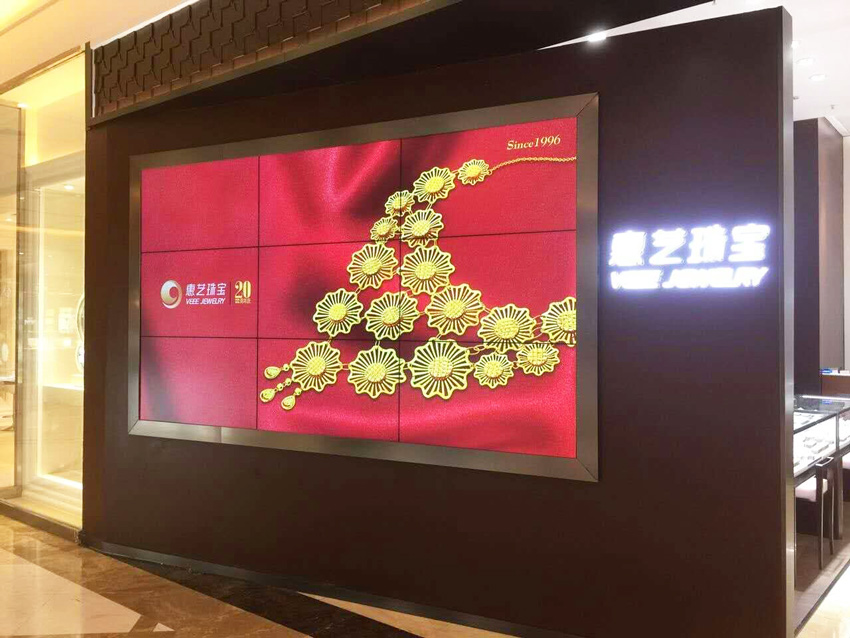 惠藝珠寶公司采用線上、線下的黃金珠寶飾品銷售方式,在惠州市中心的珠寶門店率先采用廣州信弘公司46寸3X3超窄邊液晶拼接屏,這也是一種創(chuàng)新的產(chǎn)品宣傳方式,在珠寶賣場安裝拼接大屏幕極大提升了產(chǎn)品的檔次和門店的形象。同時珠寶門店如有新的促銷活動可在大屏幕上不定期發(fā)布,這樣會極大聚集更多人氣,珠寶飾品的銷量必定會不斷攀升。 拼接屏的投入使用,就相當于公司請了一位免費的超級珠寶飾品推銷員,把公司各種在售產(chǎn)品在大屏幕上滾動播放,46寸高清液晶拼接大屏幕與精美的珠寶飾品宣傳畫冊的完美展現(xiàn),畢將成為整個商場最吸引顧客眼球的地方。